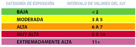 La Agencia Estatal de Meteorología publica diariamente en su página web los valores de UVI peninsulares e Insulares. Dependiendo del valor del UVI, el trabajador, teniendo en cuenta los factores anteriormente mencionados, debe tomar las medidas adecuadas para su protección de la radiación UV.
