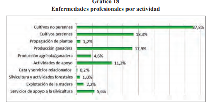 Durante este tiempo, la mayor parte de las enfermedades profesionales por actividad se han producido en cultivos no perennes y perennes que, de forman conjunta, suponen el 56%. A cierta distancia se encuentra la producción ganadera con casi el 18%, seguida de las actividades de apoyo a la agricultura y ganadería.