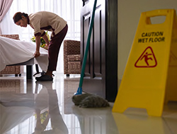 Imagen de una camarera de piso haciendo la cama y en la puerta de la habitación una fregona y un cartel de precaución piso mojado