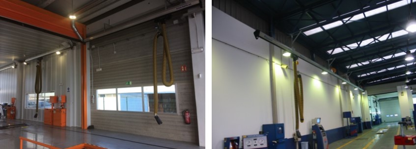 La implantación de un sistema de extracción que capture los humos de escape directamente en el foco emisor, es decir, en los tubos de escape de los vehículos, impide la puesta en suspensión y dispersión de estos contaminantes por el ambiente de trabajo.