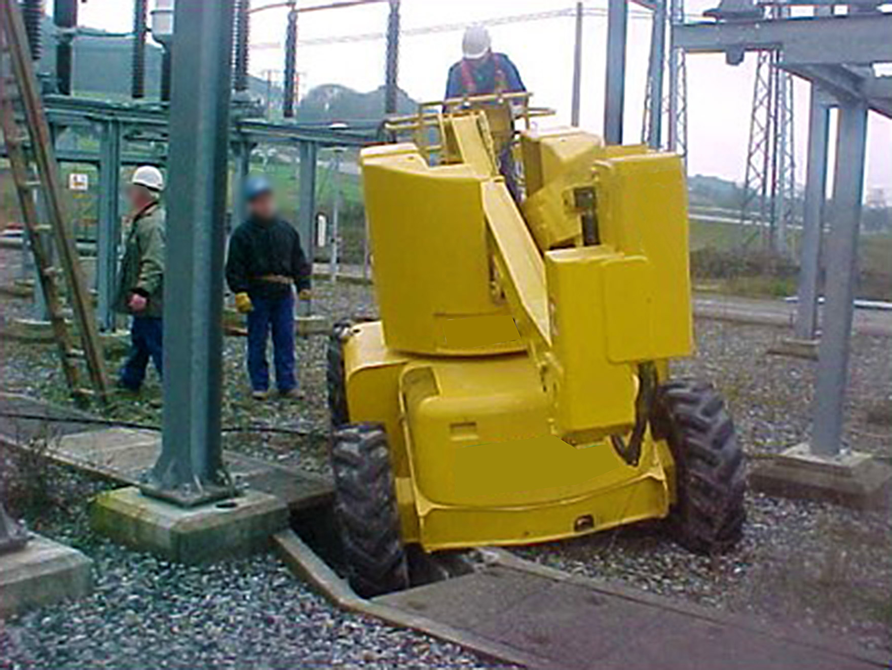 037. Plataforma elevadora móvil de personal. Desplazamiento de la máquina con personal sobre la plataforma elevada, caída desde la plataforma