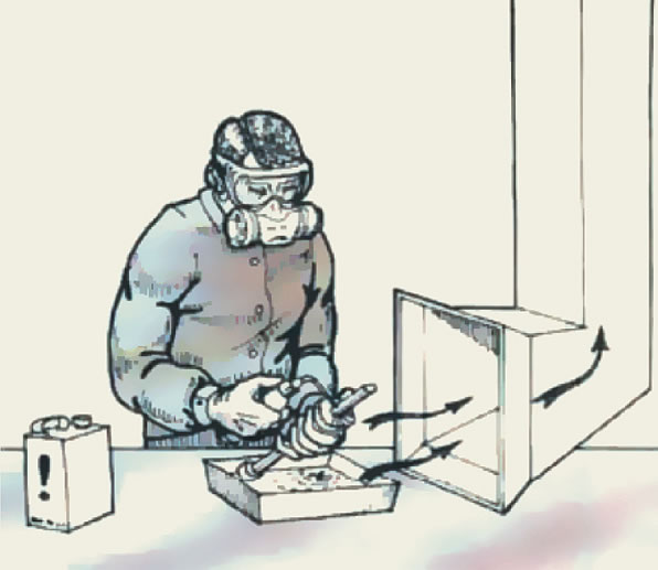 Ver figura 6, "Ventilación general forzada. Las flechas indican la dirección adecuada del aire con relación al trabajador".