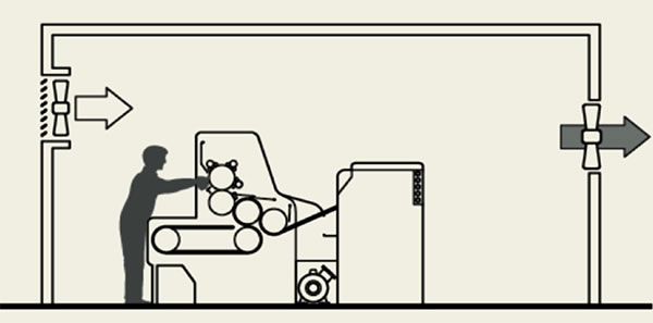 La ventilación general por dilución se recomienda durante las operaciones de limpieza que deban realizarse directamente en la máquina offset, siempre que los contaminantes sean de baja toxicidad, sus niveles de concentración sean bajos y existan múltiples focos de contaminación que hagan que los sistemas de extracción localizada no sean viables.