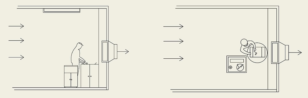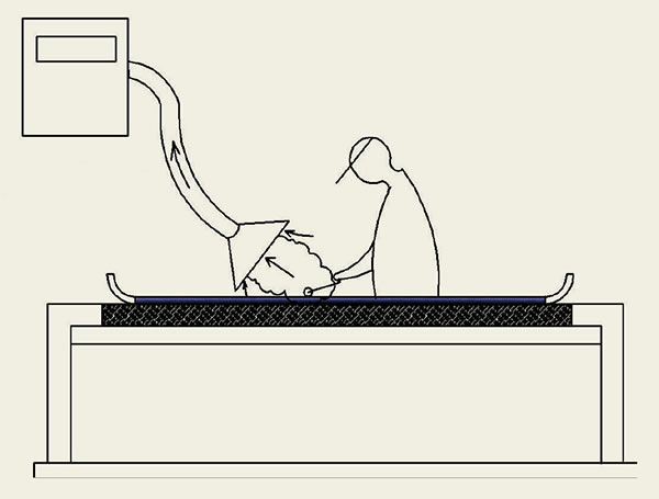 • Mesas de trabajo con aspiración. La velocidad de captación, es decir, la velocidad de aire mínima medida en el punto más alejado del dispositivo de captación no debe ser inferior a 0,3 m/s en una atmósfera en calma.