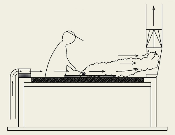 Es importante que se disponga de una mesa giratoria donde colocar la pieza para que los trabajadores no se interpongan en el trayecto del aire contaminado.