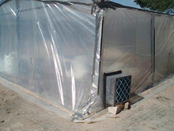 Cuando por la ubicación del lugar de trabajo la zona delimitada no puede ser lo suficiente amplia como para asegurar la protección de otras personas, o puede afectar a otros elementos o edificios (por ejemplo en un trabajo en ciudad), con el fin de controlar la dispersión de fibras y evitar las exposiciones inadvertidas, deben incrementarse las medidas preventivas, por ejemplo instalando encerramientos prefabricados de protección dotados de extractores de aire. No será necesario establecer presión negativa en su interior salvo que las mediciones así lo aconsejen.