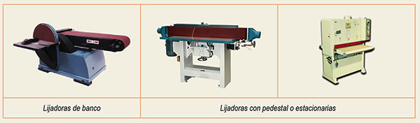 - Las lijadoras de banda ancha poseen, además de la banda, una pequeña mesa de trabajo o pupitre para apoyar el material a lijar con el disco, dado que no se desplazan como las lijadoras portátiles. Se clasifican en: lijadoras de banco y lijadoras con pedestal o estacionarias.