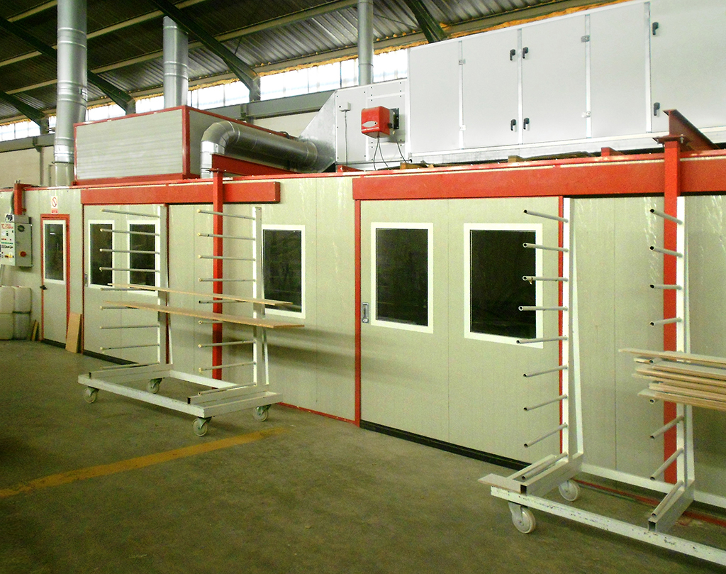 - Secado forzado, consiste en la evaporación de los disolventes y/o la reacción química de los productos sobrepuestos, que llevan al endurecimiento de la película del barniz, utilizando un túnel con circulación de aire forzado y con la contribución de una fuente de energía como: aire caliente (mediante túnel con carrusel, túnel monoplano, con planos múltiples, verticales, basculantes), radiaciones emitidas por lámparas especiales (túnel con lámparas infrarrojas y ultravioleta).