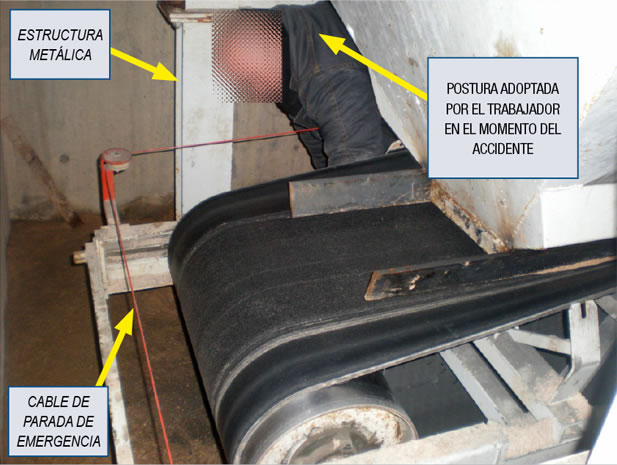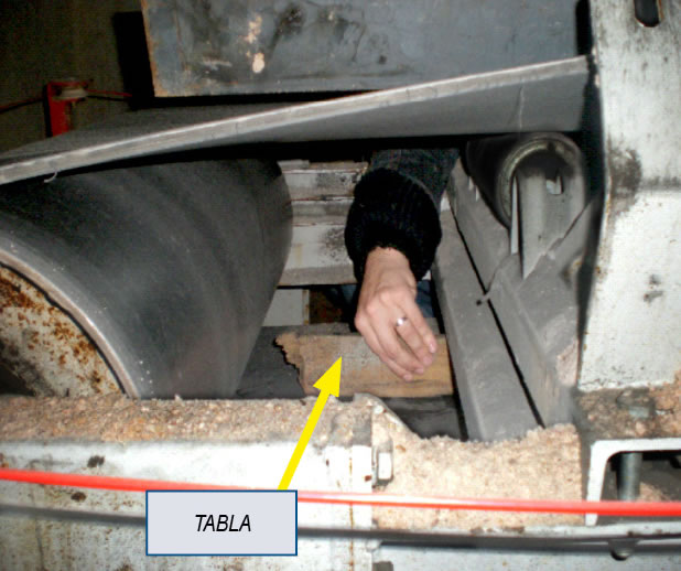 En ese momento la tabla resulta atrapada y absorbida entre la cinta y el tambor y tira el brazo del trabajador que también resulta apresado y arrastrado. El trabajador, intenta evitar el ser virtual y totalmente tragado por el mecanismo y se apalanca contra la estructura del mismo apuntalando su hombro derecho y su cabeza (cara) contra esta (ver figura 2. "Afianzamiento del trabajador en el momento del accidente"); el resultado es el arrancamiento de su miembro superior.