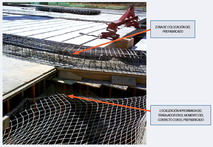 Ver figura 1, "Zona de paso del trabajador y hueco con red defectuosa por donde cae" y figura 2, "Locallización aproximada del trabajador en el momento del contacto con el prefabricado".