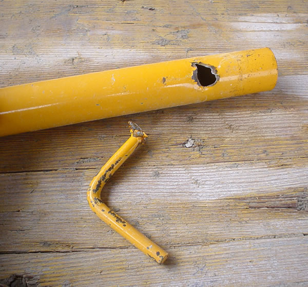 Inspeccionado el soporte de “tipo L” roto, presenta signos de haber sido sometido a una presión vertical en sentido descendente (una deformación convexa en la zona superior del punto donde estaba soldado al balaustre y una cóncava en la zona inferior).