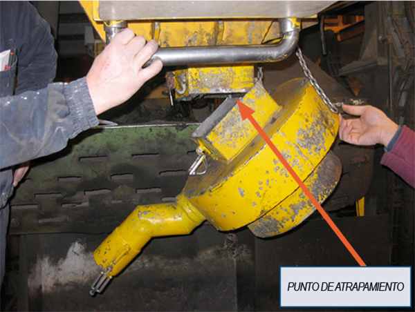 010. Atrapamiento, cizallamiento de dedo en operación de limpieza de conducto de aporte de arena en línea de llenado de cajas para conformación de moldes de fundición