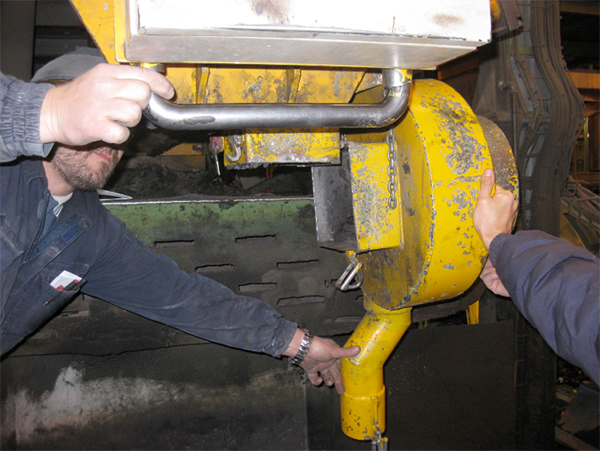 La arena con la que se llenan las cajas de molde está mezclada con distintas resinas y tiene una determinada humedad lo que produce que, en ocasiones, se apelmace y haya que desatascar el conducto. Para ello es necesario abrir una cazoleta que hace las veces de campana de aspiración con el fin de acceder sin dificultad al interior del conducto. Mediante la apertura de una "palomilla" mecánica la cazoleta bascula y queda semiabierta debido a la posición de su centro de gravedad por lo que, para facilitar en mayor medida el acceso al conducto es necesario empujarla con una mano hasta llevarla a posición vertical. En esta posición, con la otra mano, se limpia el interior del conducto.