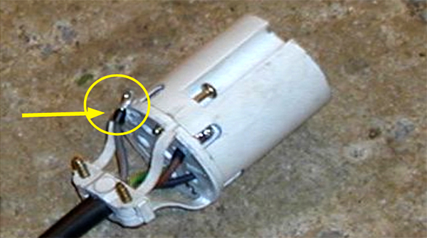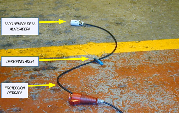 Ver figura 1, "Lado hembra de la alargadera, destornillador y la protección retirada" y figura 2, "Fase que se desconectaba".