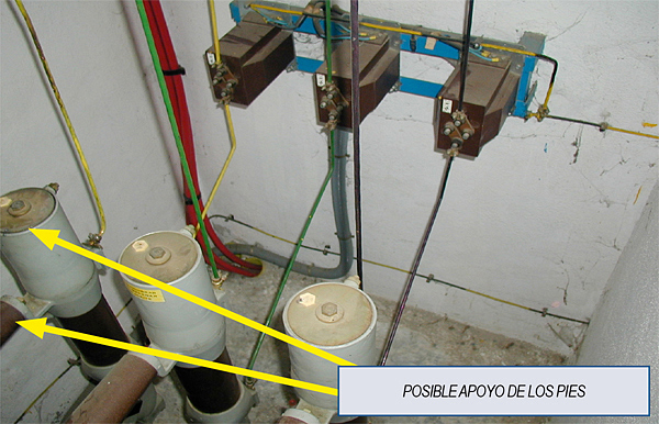 Ver figura 1, "Celda en la que sucedió el accidente", figura 2, "Posible apoyo de los pies", figura 3, "Fase a la que se sujetó el accidentado", figura 4, "Transformador 13,2 kv/380v" y figura 5, "Sistema para puesta en cortocircuito y a tierra del transformador".