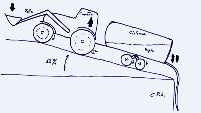 Se había acumulado cierta cantidad de agua en lo más profundo del tanque, agua que era evacuada por el accidentado mediante un tractor que impulsaba una cisterna. Una vez que el accidentado hubo arrimado y posicionado la cisterna al borde del tanque sobre una plataforma de carga con una pendiente de un 12% hacia el tanque, frenado el tractor y puesto en marcha la bomba de la cisterna con la aceleración del tractor adecuada, el accidentado bajó al tanque de tormentas para embocar la boca de aspiración de agua en lo más profundo del charco.