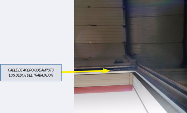 Ver figura 1, "Cable de acero que amputó los dedos del trabajador" y figura 2, "Arriba, Puerta seccional averiada, Abajo, Cuerdas que con la mano derecha manejaba el trabajador para desembragar el motor y bajar la puerta".