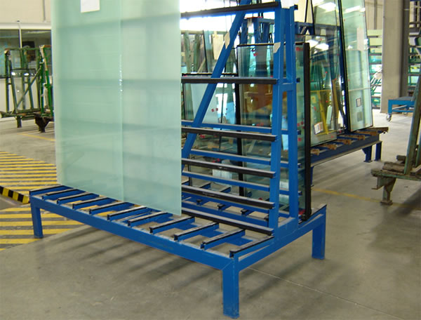 Las piezas cortadas se apilan en ambos lados de caballetes de transporte de vidrio, se flejan y luego se trasladan mediante una transpaleta manual.