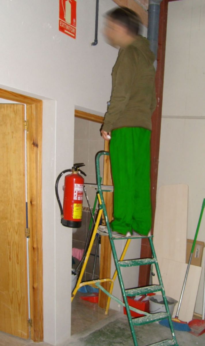 Para perforar la pared de ladrillo del cuarto de baño, de unos 30 centímetros de espesor, el trabajador se hallaba subido a una escalera de tijera (1 metro de altura) provisto de un taladro manual dotado con una broca de diámetro 12 mm. y aproximadamente de unos 30 y 40 centímetros de longitud (fotos 1 y 2).