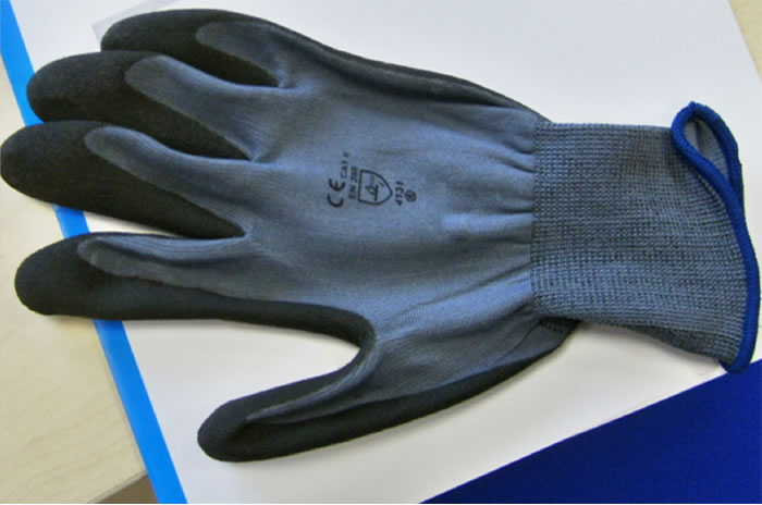 El trabajador usaba guantes de protección, de nylon con recubrimiento de PVC (foto 3).