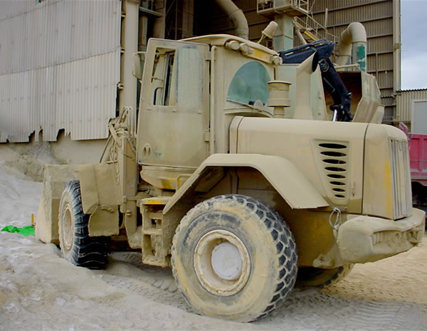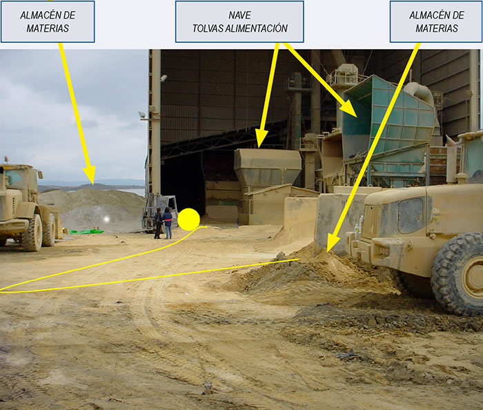 Las tolvas son abastecidas mediante una pala cargadora que transporta las materias desde los acopios situados en el exterior hasta el interior de la nave.