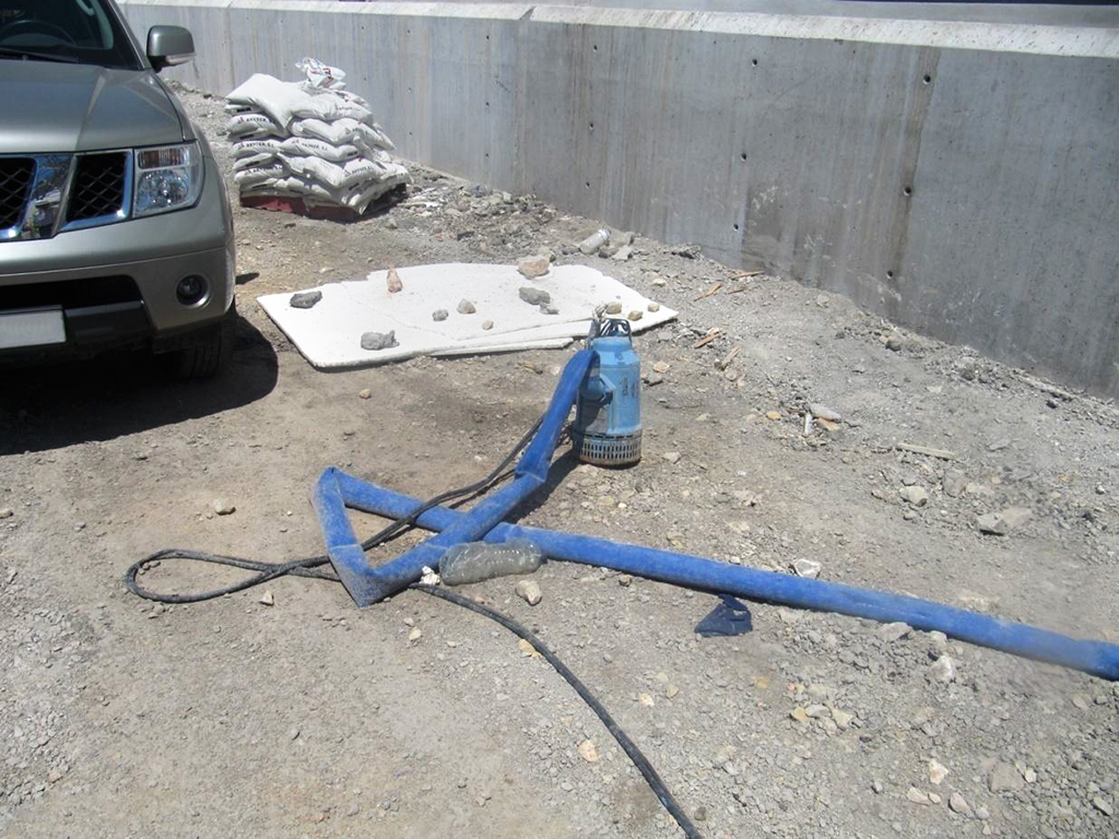 Conforme se van ejecutando los tramos resulta necesario el riego y humectación de sus superficies. Dicha operación es llevada a efecto por medio de un depósito plástico portátil de 1 m3 de capacidad, situado en el antepecho de dicha coronación y que debe ser llenado de agua de forma previa por medio de una bomba sumergida, conectada a una tubería flexible que accede a la coronación del espaldón, que bombea el agua desde un depósito inferior (a pie de espaldón) al depósito superior.