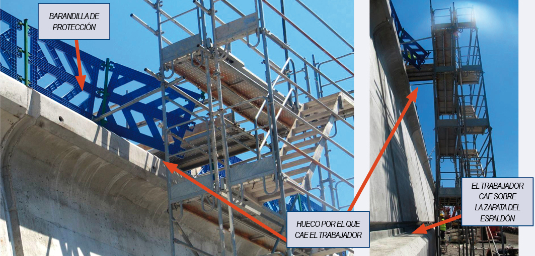 Al apoyarse en dicho tramo, se liberan las fijaciones del último montante de la barandilla, el cual había sido atado con alambre a la propia estructura de la barandilla de la pasarela de acceso, lo que provoca que se libere ésta y que caiga el trabajador por el hueco producido entre espaldón y torre de acceso, cayendo hasta la zapata del mismo, en una caída de aproximadamente 7 metros.