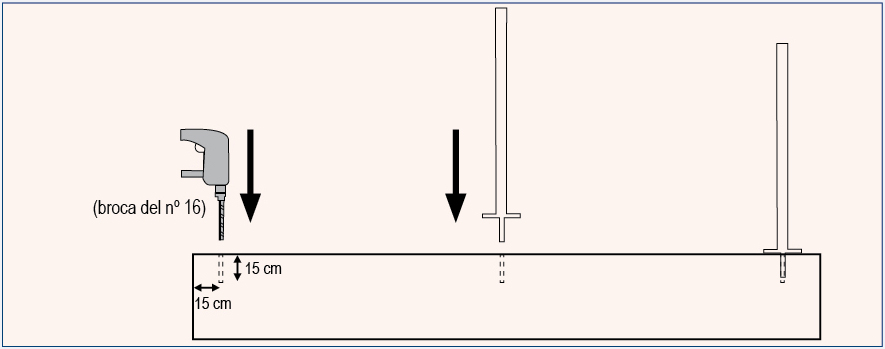- La barandilla utilizada como protección colectiva puede verse en la siguiente fotografía. Se trata de una pieza monoblock constituida por listón superior, intermedio e inferior o rodapiés. En este tipo de barandilla cada tramo apoya en dos montantes o postes denominados de pincho que se montan con la ayuda de un taladro sobre la superficie de apoyo, donde se introduce el pincho de dicho poste a una profundidad mínima de 15 centímetros. En la siguiente fotografía y croquis se pueden observar los detalles descritos.