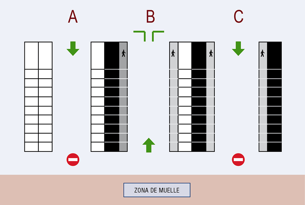 De acuerdo al criterio establecido en la NTP-852 del INSHT, se propone la configuración reflejada en el siguiente croquis, en la que se establece un único sentido de circulación y la existencia de pasillos de circulación de trabajadores.