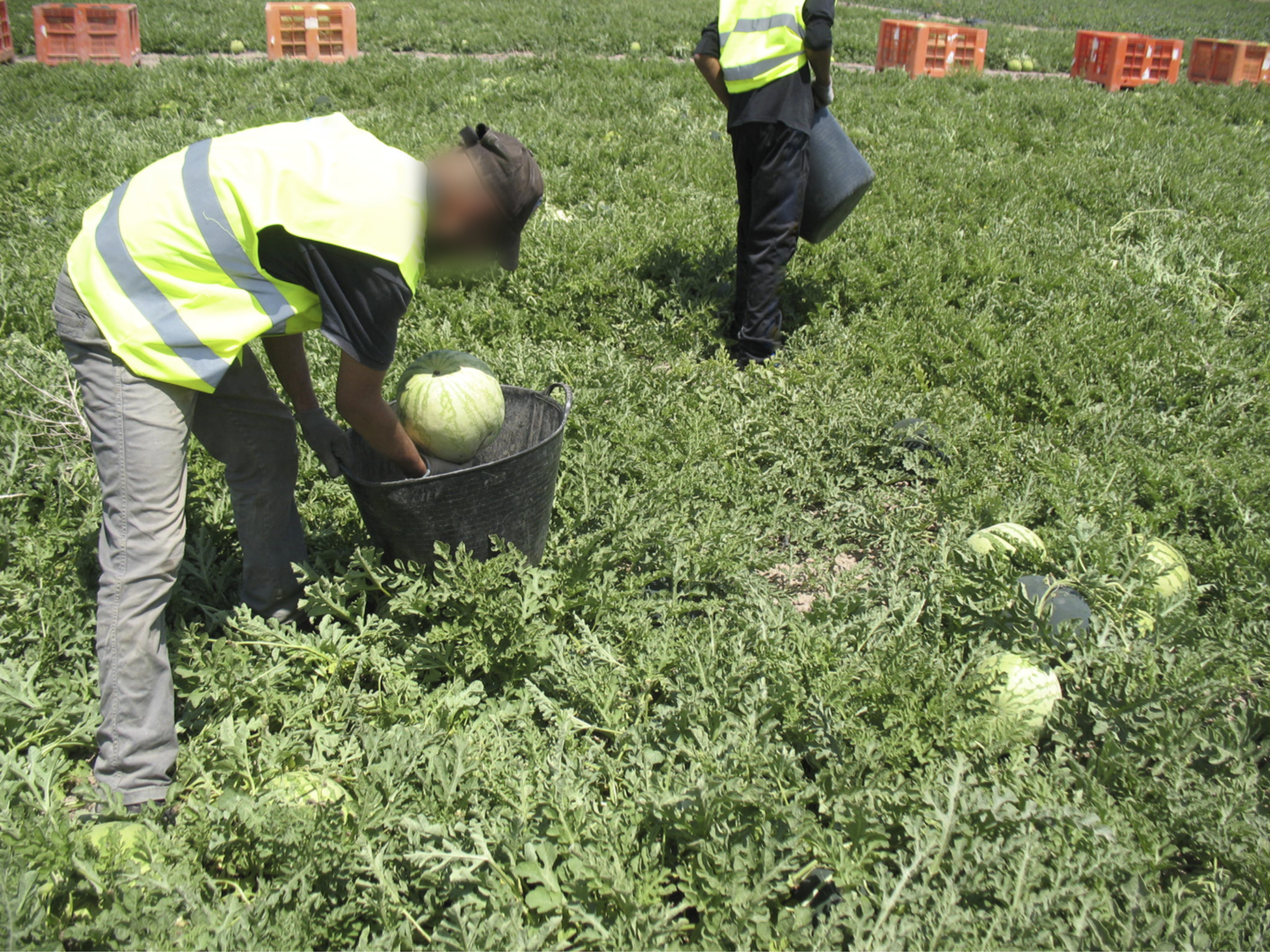 La tarea de recolectar sandías consiste, básicamente, en coger de una en una las sandías que hay sobre el terreno de la finca y depositarlas en un capazo. Una vez que éste está lleno los trabajadores lo trasladan, manualmente, hasta el box donde vierten las sandias. Este proceso se repite durante toda la jornada laboral.