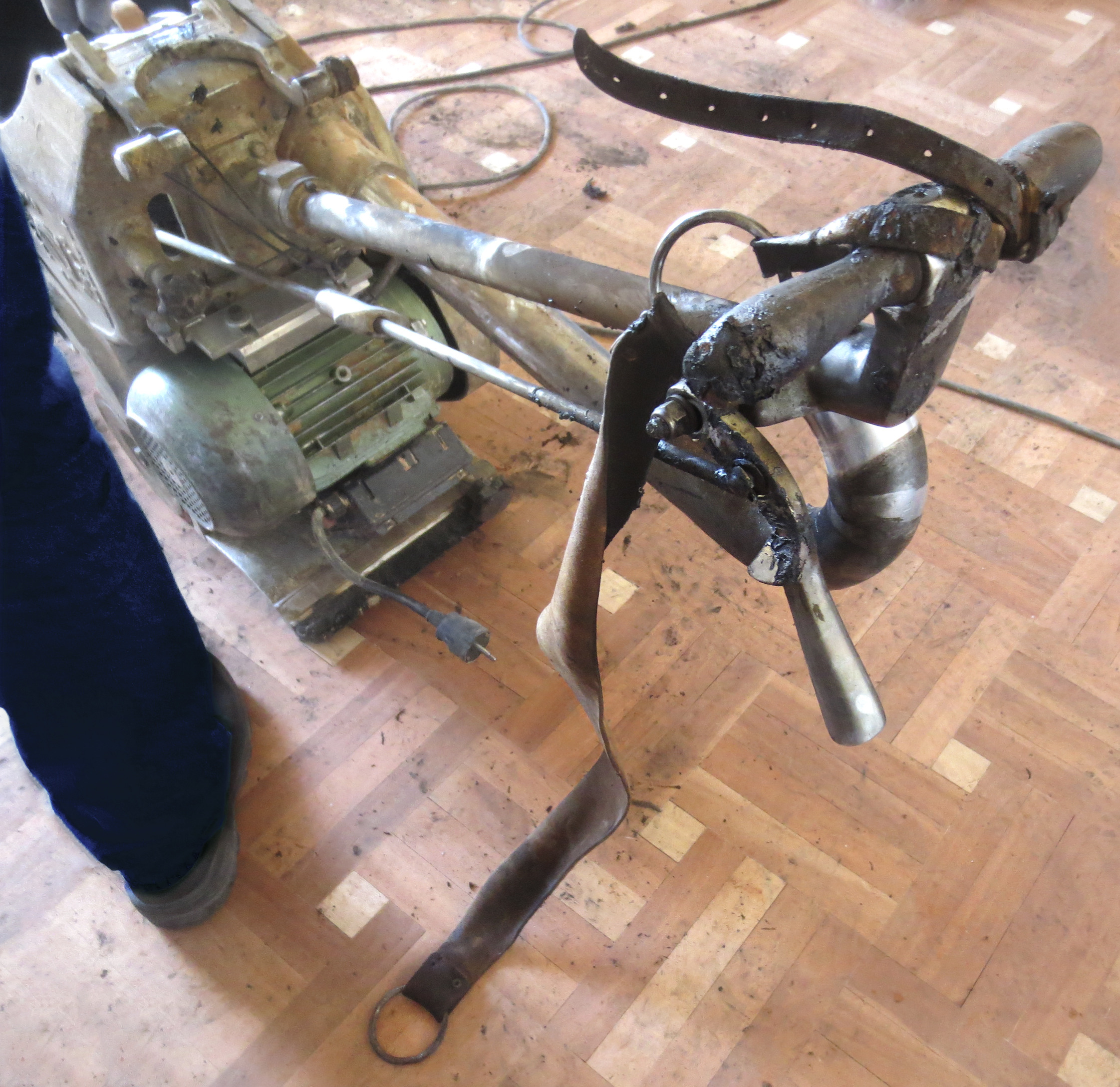 Este equipo consiste en un rodillo, en el que se montan los pliegos de lija, que es movido por un motor eléctrico de 3000w; dicho motor está montado sobre un chasis provisto de un manillar y un mando de acción del rodillo, que se mueve con ruedas tipo carrito y al que va incorporado un sistema de aspiración de polvo al que se acopla un saco. Dada su antigüedad, la lijadora dispone de un cinturón que se pasa por la cintura del operario y, a su vez, se engancha al manillar de la máquina, lo que permite tener mejor control sobre el tirón de la máquina, ya que tiene un peso considerable (entre 60-80kg).