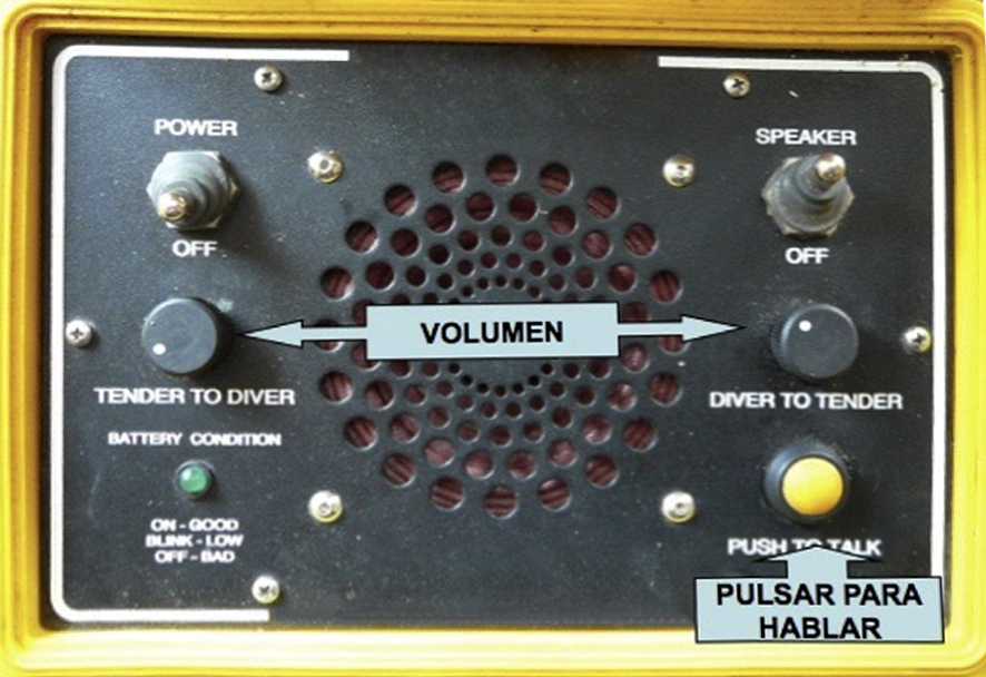 5. Se deberá poner a disposición de los trabajadores el equipamiento mínimo obligatorio para la utilización de los distintos sistemas de buceo empleados en trabajos en medio hiperbárico, en este caso, buceo con suministro desde superficie, previstos en el art. 6 de la OM 14/10/1997. Esencialmente, se deberá disponer de cuadro de distribución de gases; umbilicales con manguera, cable de comunicaciones y tubo para el neumo, de material resistente y unidos adecuadamente; sistema de comunicaciones por telefonía por cable y equipo de máscara facial o casco a demanda equipado con comunicaciones y válvula antrirretroceso, así como una botella de emergencia por cada buceador.