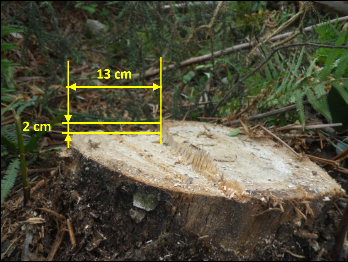 - Ejecución incorrecta de los cortes direccionales de la muesca de caída. Los cortes oblicuo y horizontal de la muesca de caída no cumplieron los parámetros aconsejados para garantizar el control de la caída. Esto es: el ángulo del corte oblicuo no llegó a los 45º en toda su longitud, el corte horizontal (13 cm) superó los 8 cm recomendados (1/4 del diámetro medio del tronco de 32’5 cm) y con ello no se configuró un adecuado eje de vuelco. (Ver Figura 5).