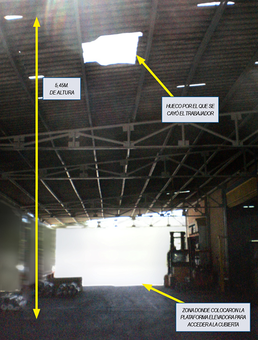 Ver figura 1, "Zona donde colocaron la plataforma elevadora para acceder a la cubierta y hueco por el que se cayó el trabajador (altura 5,45 m.)".