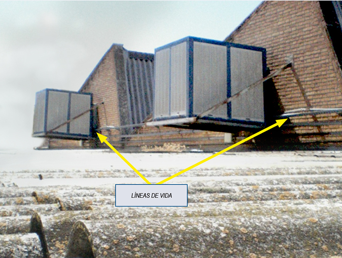 Aunque estas medidas deberían corresponder a quien realizó el proyecto de ejecución cuando se realizó la obra de construcción de la nave, en dicho proyecto se deberían haber tenido en cuenta los trabajos posteriores de mantenimiento tales como la reparación de cubierta y la ubicación de las unidades de refrigeración evaporativa del aire acondicionado. O bien si la colocación de dichas unidades fue posterior a la entrega de la nave, se debería haber tenido en cuenta la ubicación de la línea de vida.