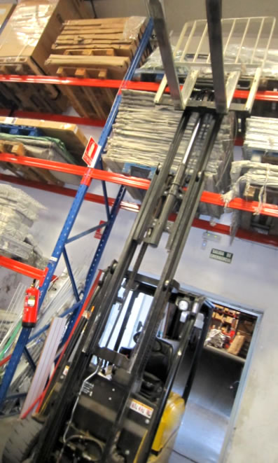- El procedimiento adecuado para coger una carga que está elevada en una estantería consiste o bien bajar el palé donde está la carga hasta el suelo o bien utilizar una plataforma elevadora de personas para alcanzar la mercancía que se necesite.