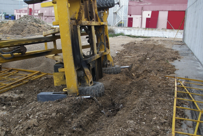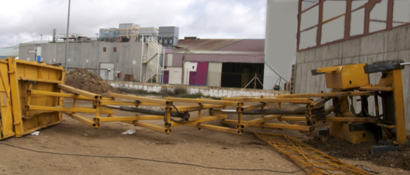 - Ubicación incorrecta de la PEMP, puesto que 2 de las ruedas y, por tanto, sus estabilizadores quedaron situados sobre terreno de hormigón, mientras que las 2 ruedas y estabilizadores restantes, los más alejados al pórtico de la nave, quedaron situados en el terreno inestable y no compacto.